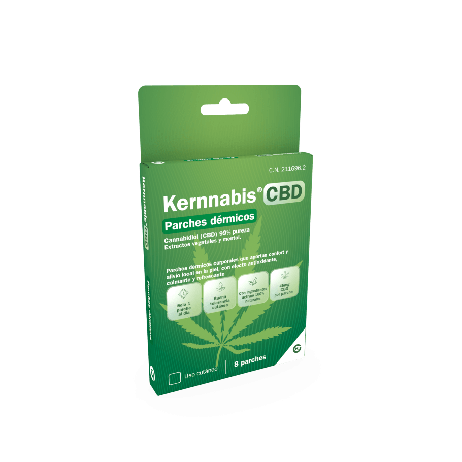 - Kernnabis® CBD parches dérmicos contiene cannabidiol (CBD) 45mg, mentol y extractos vegetales que proporcionan, con un parche al día, confort y alivio local en la piel para un efecto calmante y refrescante durante 24h.